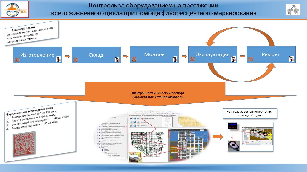 При помощи флуоресцентного маркирования однозначно происходит идентификация каждого элемента объекта. Обходчик при проверке состояния объекта считывает при помощи терминала сбора данных информацию об объекте с нанесенной маркировки и при необходимости вводит данные по показателям на момент осмотра. При подключении терминала сбора данных к Электронно-техническому паспорту (проводным или беспроводным способом) производится передача информации о результатах обхода в Электронно-технический паспорт. При данном подходе достигается возможность контроля за состоянием оборудования при плановых и внеплановых осмотрах эксплуатируя опасный производственный объект, а также механизм позволяет вводить данные обходчиком и хранить эти данные в унифицированном виде.